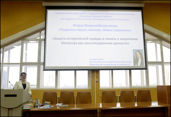 28 апреля 2022 года в актовом зале юридического факультета ВГУ в рамках Второй Всероссийской акции «Поделись своим знанием. Новые горизонты», проводимой под эгидой Общероссийской общественно-государственной просветительской организации «Российское общество «Знание», состоялось выступление перед студенческой аудиторией доктора юридических наук, доцента Сазонниковой Елены Викторовны на тему «Защита исторической правды и память о защитниках Отечества как конституционные ценности».
