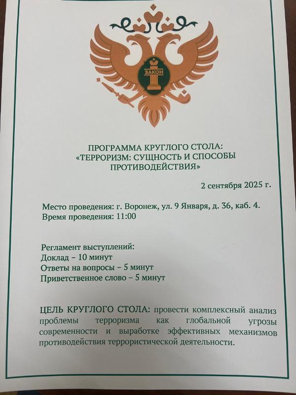2 сентября, в преддверии Дня солидарности в борьбе с терроризмом, в Управлении Минюста по Воронежской области прошел студенческий круглый стол на тему «Терроризм: сущность и способы противодействия».