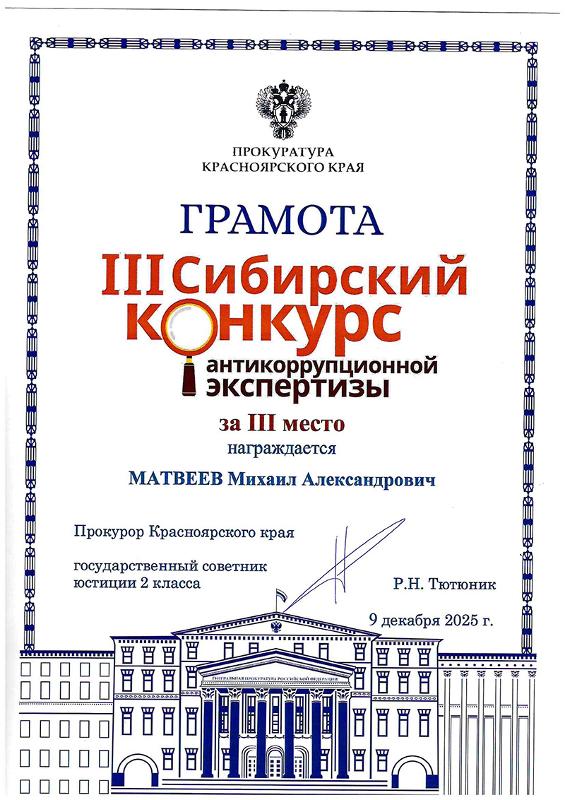 Сибирский федеральный университет совместно с Администрацией Губернатора Красноярского края, прокуратурой Красноярского края, Управлением Минюста России по Красноярскому краю, Красноярским региональные отделением Ассоциации юристов России и Советом ректоров вузов Красноярского края организовали и провели III Сибирский конкурс антикоррупционной экспертизы.