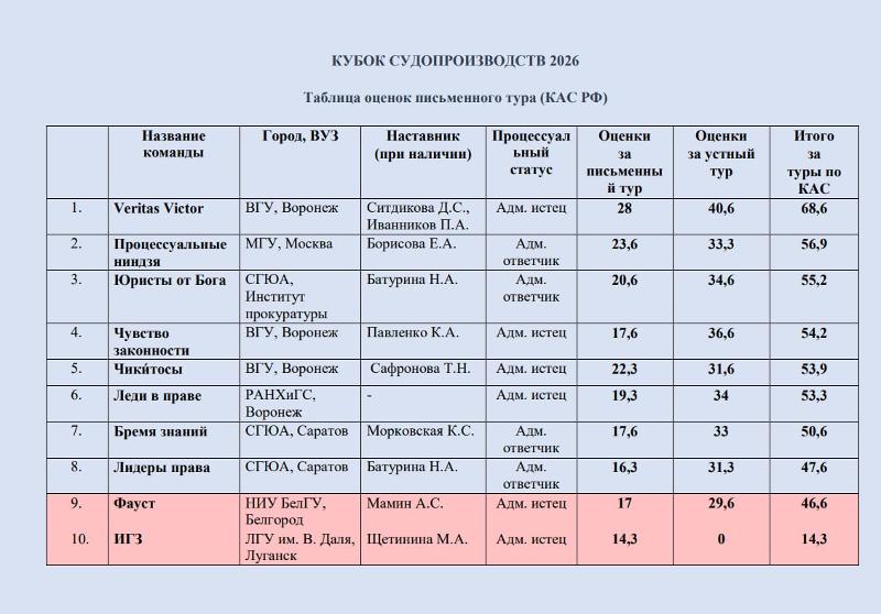 После письменного этапа и устных слушаний лидирующие позиции занимают команды из ВГУ, МГУ и СГЮА. Во втором туре участникам предстоит подготовить позицию по спору, рассматриваемому в порядке ГПК РФ.