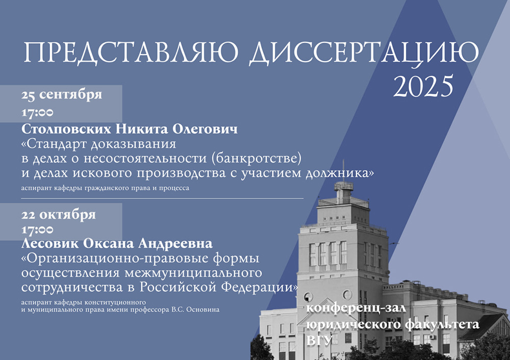 26 апреля в конференц-зале юридического факультета ВГУ Попов Владислав Александрович, аспирант и преподаватель кафедры конституционного и муниципального права, представил первую главу своей будущей кандидатской диссертации (см. подробнее).