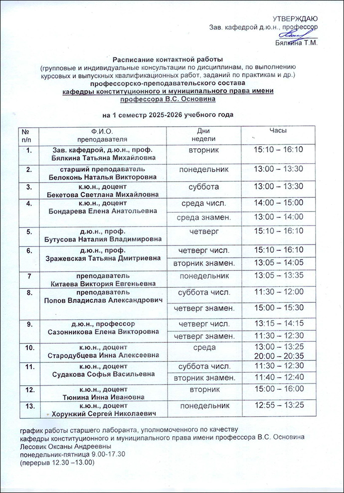 Факультет / Структура / Кафедры / Кафедра конституционного и муниципального права имени профессора В.С. Основина / Расписание контактной работы