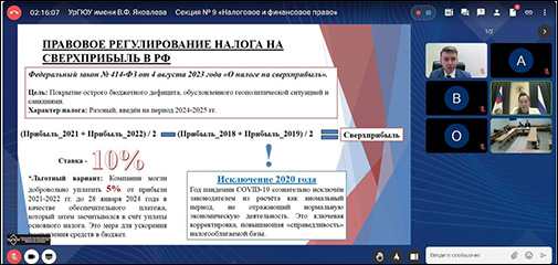 В рамках международной конференции была организована секция по налоговому и финансовому праву. На заседании секции принимали участие студенты и аспиранты РГУП им. В.М. Лебедева, СГЮА, МГИМО и других ведущих вузов России. Также в онлайн формате принял участие Денисов Илья Юрьевич, аспирант кафедры финансового права ВГУ, с темой доклада: «Дифференциация финансово-правового регулирования признания задолженности безнадежной к взысканию».